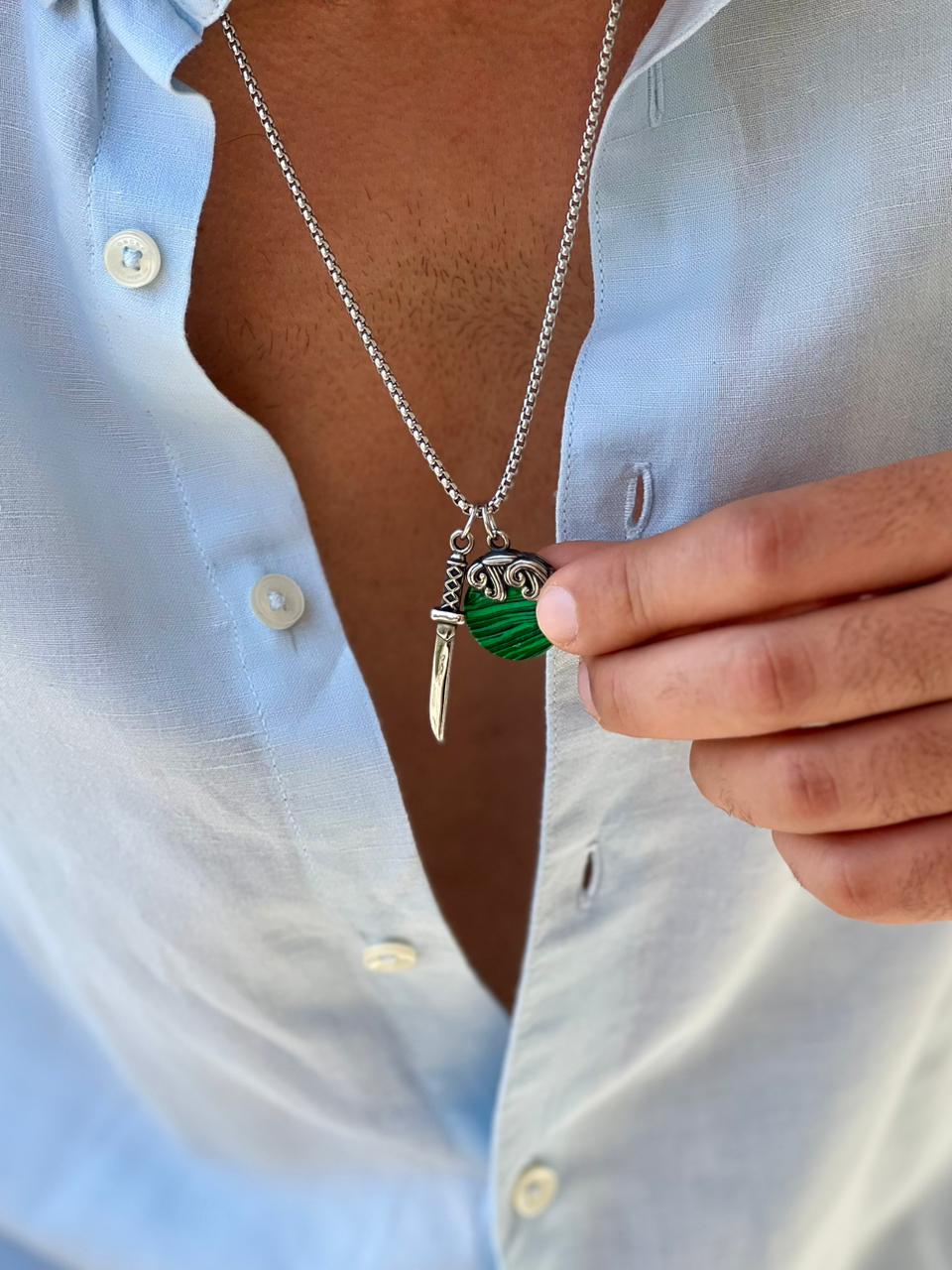 Modern Dagger Malachite Stone Necklace for Men in Egypt with a bold and minimalist design. Durable, tarnish-resistant, and perfect for everyday wear.